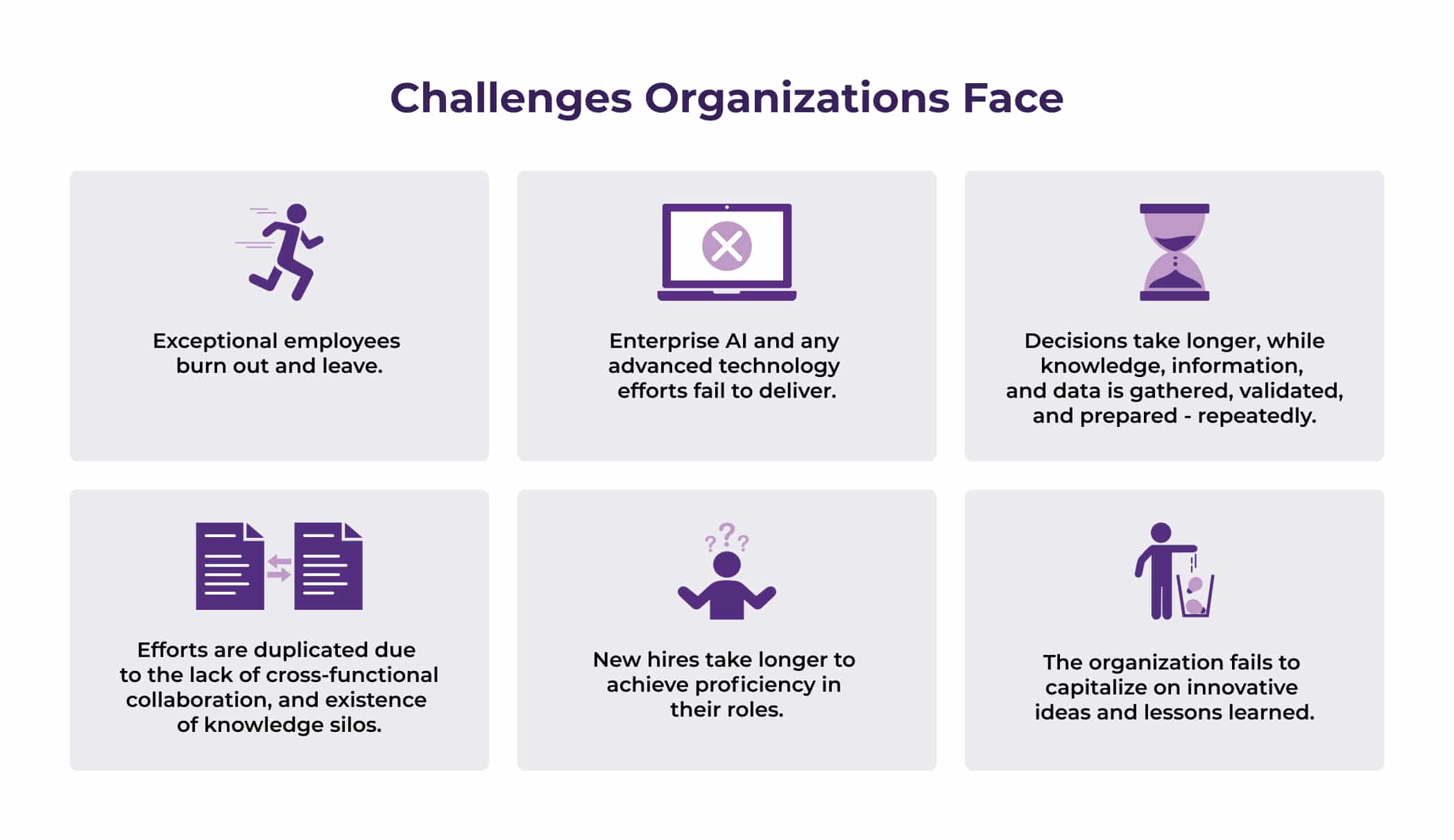 Challenge: Lack of cross-functional collaboration, existence of knowledge silos, and duplication of organizational effort