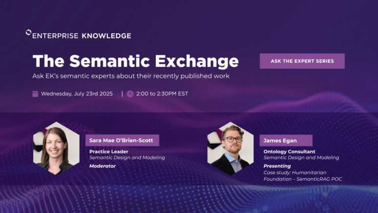Enterprise Knowledge is concluding the first round of our new webinar series, The Semantic Exchange. In this webinar series, we follow a Q&A style to provide participants an opportunity to engage with our semantic design experts on a variety of topics about which they have written. This webinar is designed for a variety of audiences, ranging from those working in the semantic space as taxonomists or ontologists, to folks who are just starting to learn about structured data and content, and how they may fit into broader initiatives around artificial intelligence or knowledge graphs.